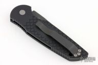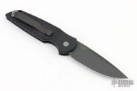 This TR-3 X1-M by Pro-Tech Knives features a black spear point blade. The handle has a black aluminum handle with stainless steel backspacer with lanyard hole, tip up blade stainless steel clip. Includes the original box and papers. New condition.