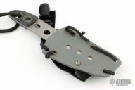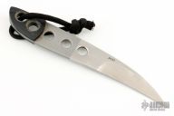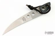 This neck knife from Bud Nealy features a hand rub satin finished  blade with .097" blade stock and .703" blade depth, full tang construction. The handle has black/green G-10 scales. Comes with a magnetic kydex sheath. Numbered 3437. Has some light scuffs, otherwise excellent condition.