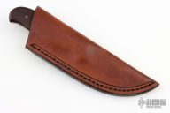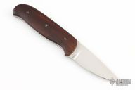 This fixed blade (#7221) has a hand rubbed satin finish blade with notched thumbrest, .097" blade stock and 1.015" blade depth, full tang construction. The handle has cocobolo scales with three mosaic pins and a brass lanyard tube.  Comes with a brown leather sheath. Excellent condition.