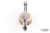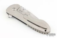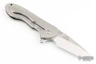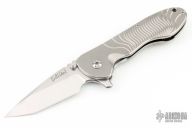 This Fallen Star by Gillian Knives features a satin finished blade with stonewashed flats, notched thumbrest and flipper, single thumbstud. The handle has a tumbled titanium frame and tip up clip, notched titanium backspacer. Nice detent, lockup and blade seating. Comes with a zippered case and COA. Excellent condition.