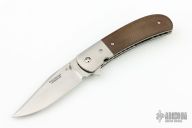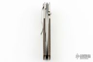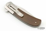 This Classic flipper from Phil Boguszewski features a hand rub satin finished blade with single thumbstud and a notched flipper. The handle has jeweled titanium liners along with green canvas micarta scales, orange peel finished titanium bolsters, and a satin finished pocket clip that is positioned for tip down carry. The backspacer is black linen micarta. The blade is centered when closed. Flips like you'd expect a Boguszewski to flip- effortlessly! Locks up with no play and has nice crisp detent. This rare piece is in excellent condition and shows no signs of use or carry.