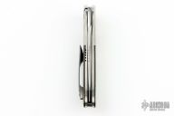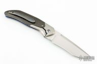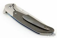 This Stingray by Daniel Galloway features a hand rubbed satin finished recurve blade with Lee Williams kickstop flipper. The handle has orange peel finished titanium bolsters, lightning strike carbon fiber scales, satin finished titanium liners, orange peel finished Zirconium backspacer and tip up clip. Nice detent, action, lockup and blade seating. Comes with a zipper case. Has a couple light scuffs, excellent condition otherwise.