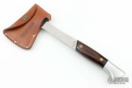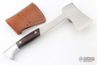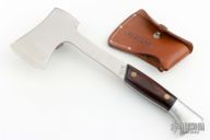 This Lightweight Axe by Western Cutlery features a satin finished blade, .171" blade stock and 2.875" blade depth, full tang construction. The handle has an aluminum butt, dymondwood scales with black spacers and brass pins. Comes with original box and brown leather sheath. Excellent condition.