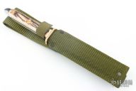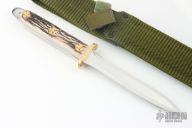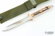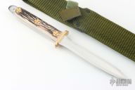 The M4 is one of EKs most popular models.  This is a commemorative knife issued in 1991 celebrating John Ek's 50th anniversary of knifemaking.  Blade is highly polished and features anniversary gold engraving.  The guard is gold plated and engraved as are the 6 cross nut fasteners.  Heavy stag handle scales. Comes with original box and sheath. Excellent condition.