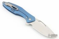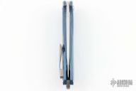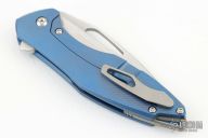 This Mini Arius by Koenig knives features a brightwashed w/ PF finished blade with thumbhole and flipper. The handle has a blue anodize finished corda titanium frame with a titanium tip up clip, and titanium backspacer. Has ceramic bearings and a ceramic detent ball. Nice detent, lockup and blade seating. Comes with original box and COA September 14, 2023. Excellent condition. G1B1.
