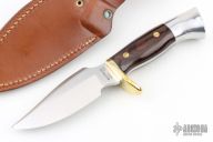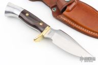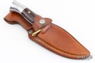 This knife by Westmark features a satin finished blade with false top edge, .176" blade stock and 1.489" blade depth, 3/4 full tang construction. The handle has a brass guard and pins, aluminum butt cap, dymondwood scales. Comes with original box and sheath. Excellent condition. #08392