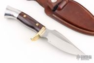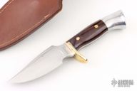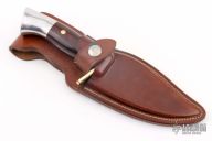 This knife by Westmark features a satin finished blade with false top edge, .176" blade stock and 1.489" blade depth, 3/4 full tang construction. The handle has a brass guard and pins, aluminum butt cap, dymondwood scales. Comes with original box and sheath. Has a few light scratches and spots on the blade, otherwise good condition. #02215