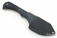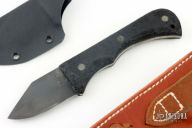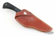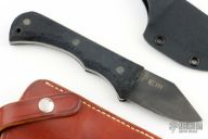 This knife by Elmer Roush III features a black blade with .154" blade stock and 1.320" blade depth, full tang construction. The handle has horsestall rubber scales with black canvas micarta pins. Comes with a brown leather sheath and a kydex sheath. Has some light scuffs, otherwise excellent condition. Came from the 2022 Blade Show originally.