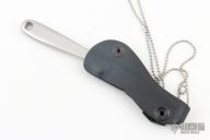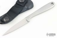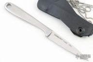 This integral neck knife from Tom Maringer features a mirror finished blade. The handle has a bead blasted stainless steel with lanyard hole in pommel. Includes kydex neck sheath with removable belt loop.  Numbered #662, dated 1991. Has a few light scratches, otherwise excellent condition.