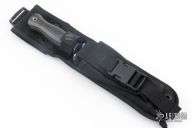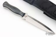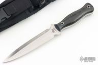 This knife features a double-edged satin finished blade with a full tang construction. .273" Blade Stock. 1.227" Blade Depth. The handle has micarta scales. Includes a nylon belt sheath. Excellent Condition.