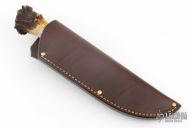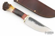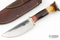 This Skinner by Jim Behring features a satin finished and hammer marked hollow ground blade with a false top edge, .179" blade thickness and 1.534" blade depth, hidden tang construction. The handle has a brass guard and crown stag cap, black/red/stainless spacer pattern. Horsehide stacked leather. Great look and feel. Comes with brown leather belt sheath. New from maker!