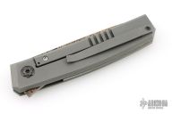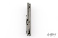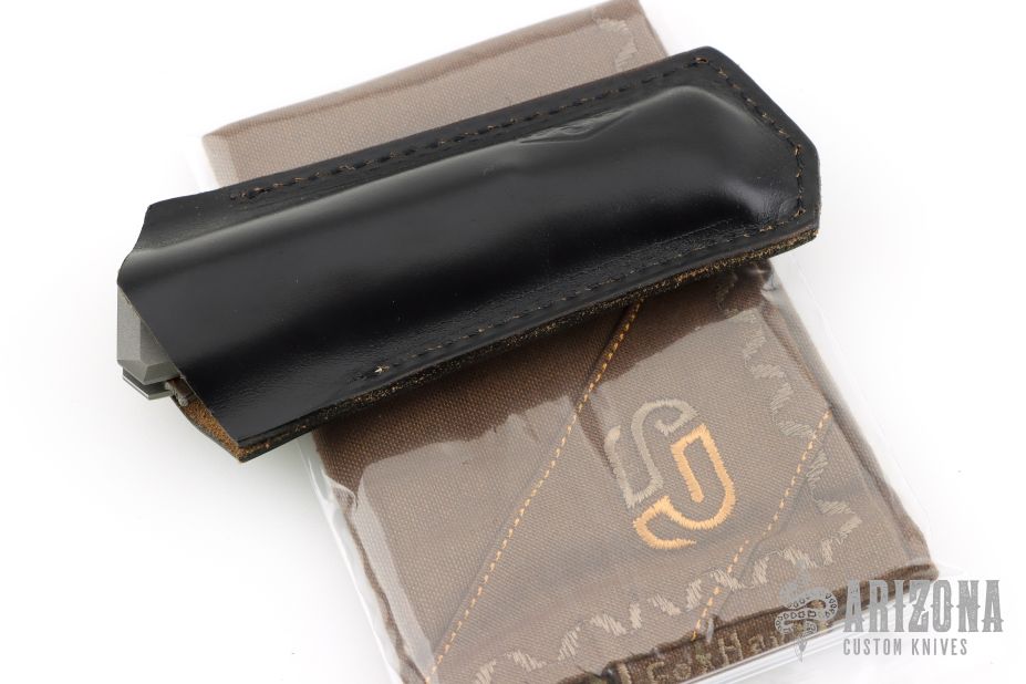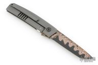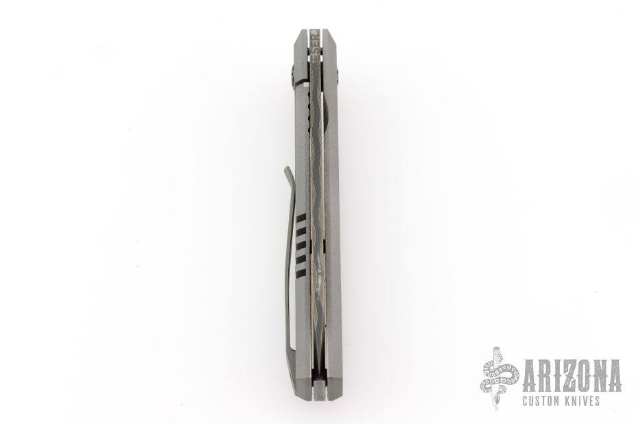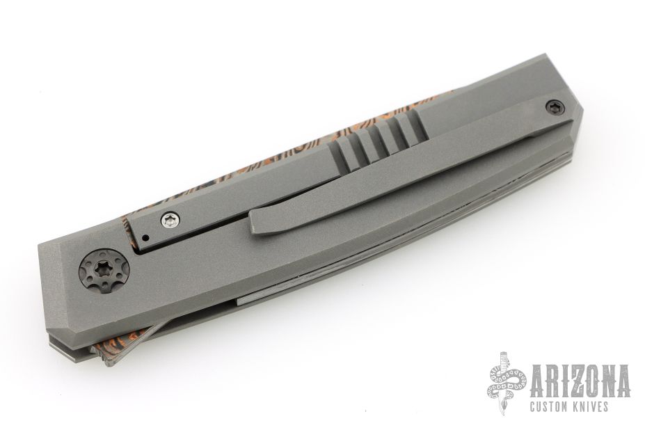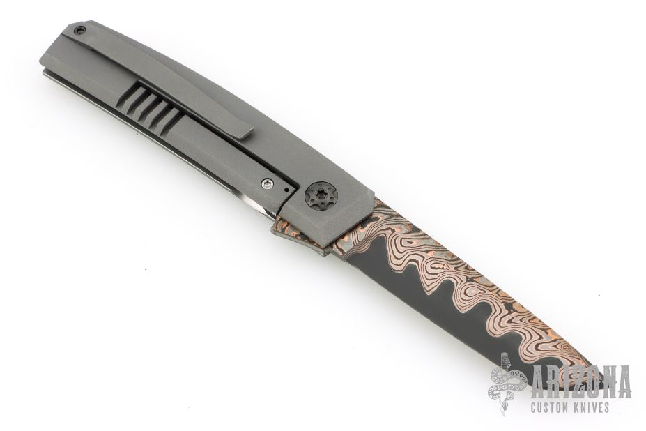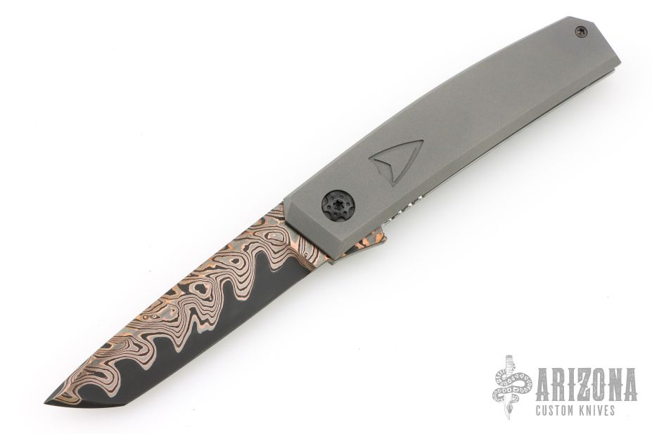 This Tengu OS flipper by Jared Oeser features a Bakers Forge Copper San Mai Damascus blade with 80CRV2 core, notched flipper tab. The handle has a bead blasted titanium frame with mutant shield, matching Copper San Mai Damascus floating backspacer, tip up titanium clip. Nice detent, lockup and blade seating. Comes with original box, black leather pocket sheath, hank and COA dated 8/15/2022. Excellent condition.