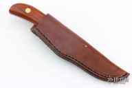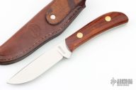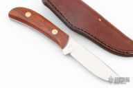 This Hunter by Northwoods Knives features a mirror finished blade with .121" blade stock and .924" blade depth, full tang construction. The handle has cocobolo scales with brass pins. Comes with a brown leather sheath. Excellent condition. Dated 2003