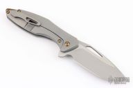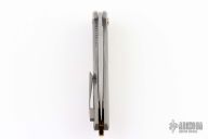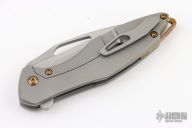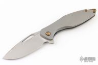 This Mini Arius by Koenig knives features a Burnished w/ PF finished blade with thumbhole and flipper. The handle has a bead blasted titanium frame with pattern milling, a titanium tip up clip, anodized titanium backspacer. Has ceramic bearings and a ceramic detent ball. Nice detent, lockup and blade seating. Comes with original box and COA January 29, 2024. New condition.