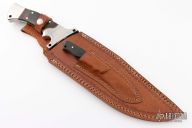 This set by Ozair knives features a mirror finished blade with false top edge, fullers and fileworked spine, .191" blade stock and 2.256" blade depth, full tang construction. The handle has a stainless steel bolsters, canvas micarta scales with red liners, red and brass spacers, fileworked tang. Comes with a hand tooled brown leather sheath that holds both knives. The smaller knife features a mirror finished blade with fileworked spine, .152" blade stock and .954" blade depth, full tang construction. The handle has a stainless steel bolsters, canvas micarta scales with red liners, red and brass spacers, fileworked tang. 3.25" blade and 7" overall. Excellent condition.