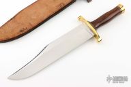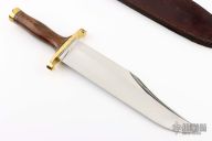 This bowie by Bob Pride features a mirror polished blade with false top edge, .356" blade stock and 1.945" blade depth, hidden tang construction. The handle has a brass guard and butt, rosewood grip with black/brass spacers. Comes with a brown leather sheath. Excellent condition.