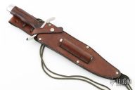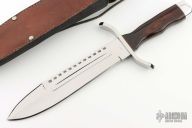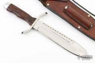This knife by Ed Love features a mirror polished double edged blade with sawteeth and fullers, .242" blade stock and 1.722" blade depth, hidden tang construction. The handle has a stainless steel guard and aluminum butt with a dymondwood grip with red and black spacers. Comes with a brown leather sheath. Has some light scratches and a couple very small oxidation spots, otherwise good condition.