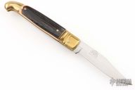 This leverlock auto features a satin finished blade with a fileworked blade spine and spring. The handle has brass bolsters and butt, stag scales and brass liners. Has some scratches, otherwise excellent condition.