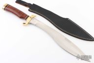 This knife by Ozair knives features a satin finished recurve blade with false top edge, .173" blade stock and 2.380" blade depth, hidden tang construction. The handle has a brass guard and butt, stacked leather grip with red/brass/buffalo horn spacers. Comes with original black leather sheath. Has some light scratches and patina, otherwise excellent condition.