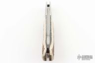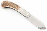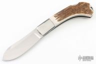 This large lockback by Eldon Peterson features a mirror finished blade with a single nail nick. The dovetailed bolsters are composed of titanium and are nicely complimented by Elk horn scales. Comes with a zipper case. Has some light scratches, excellent condition otherwise.