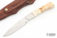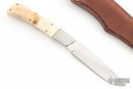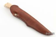 This knife by Andre Schoeman features a satin finished blade with .119" blade stock and .747" blade depth, full tang construction. The handle has dovetailed stainless steel bolsters, warthog tusk scales with copper liners. Comes with a brown leather sheath. Has a couple light scratches, otherwise excellent condition.
