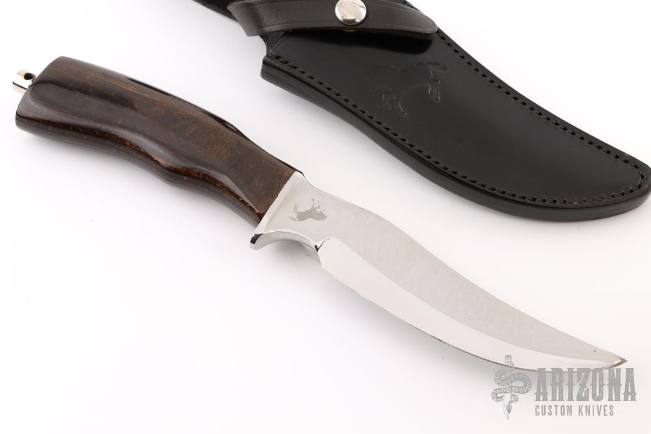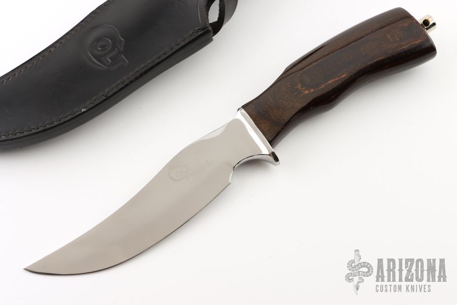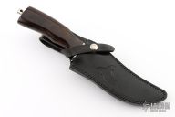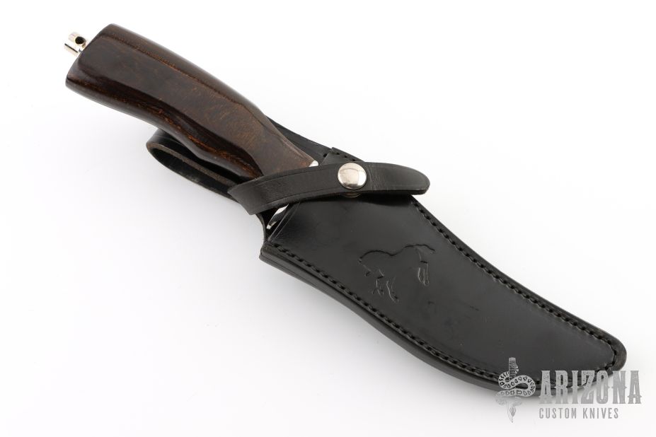 This knife from Colt features mirror polished blade with integral guard, .255" blade stock and 1.306" blade depth, hidden tang construction. The handle has a dymondwood grip with a tang nut with lanyard hole. Comes with a black leather sheath. Has some light scratches, otherwise excellent condition.