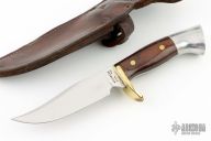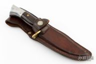 This knife by Westmark features a satin finished blade with false top edge, .171" blade stock and 1.212" blade depth, 3/4 full tang construction. The handle has a brass guard and pins, aluminum butt cap, dymondwood scales. Comes with a brown leather sheath. Has some light scratches, has been resharpened, otherwise good condition. #03412