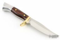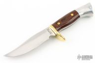 This knife by Westmark features a satin finished blade with false top edge, .171" blade stock and 1.212" blade depth, 3/4 full tang construction. The handle has a brass guard and pins, aluminum butt cap, dymondwood scales. Has "Burton Smith" on the blade. Has been resharpened, has scratches, otherwise good user condition. #22343