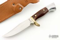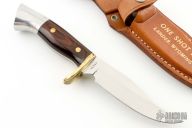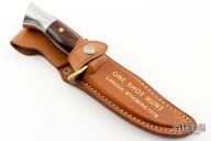 This knife by Westmark features a satin finished blade with false top edge, .171" blade stock and 1.212" blade depth, 3/4 full tang construction. The handle has a brass guard and pins, aluminum butt cap, dymondwood scales. Comes with a brown leather sheath. Has scratches, has been resharpened, otherwise good condition. #15975. The sheath reads "ONE SHOT HUNT" Lander, Wyoming 1978