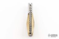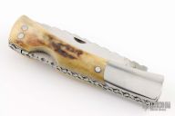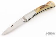This lockback by Bob Wiygul features a satin finished blade with nail nick and fileworked spine. The handle has dovetailed stainless steel bolsters, stag scales, fileworked stainless steel liners, fileworked stainless steel backspacer. Has some scratches, otherwise good condition.
