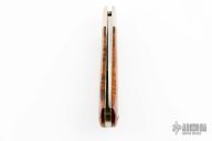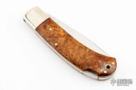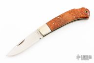 This lockback by AG Russell has a satin finished blade with nail nick. The handle has nickel silver bolsters, Amboyna burl wood scales with nickel silver pins, nickel silver liners and a stainless steel backspring. Has a couple small spots on the blade, otherwise excellent condition.