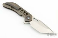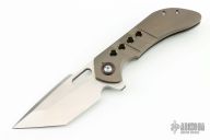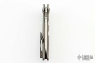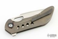 This Mutt flipper by Steve Dumchus features a satin finished harpoon style blade, thumbhole, notched thumbrest and flipper. The handle has an anodized and tumble finished titanium frame with a matching tip up clip and micarta backspacer. Matching micarta pivot collars. Rides on bearing, nice detent, lockup and blade seating. Excellent condition.