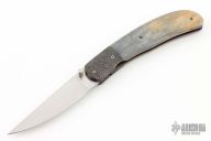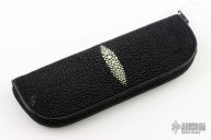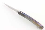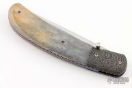 This Linerlock by Michael Fong features a hand rub satin finished blade with a single thumbstud. The handle has dovetailed Devin Thomas "Totem" Damascus bolsters, giraffe bone scales, fileworked and anodized titanium liners, anodized titanium backspacer. Nice detent, lockup and blade seating. Dated 2003 and #86. Comes with a stingray skin zippered case. Excellent condition.