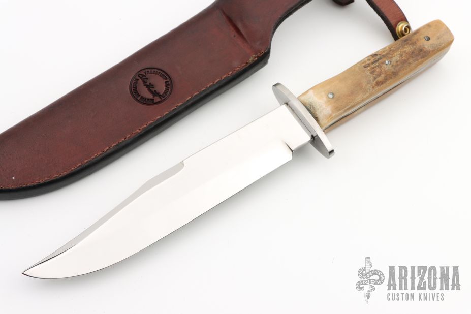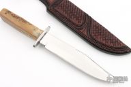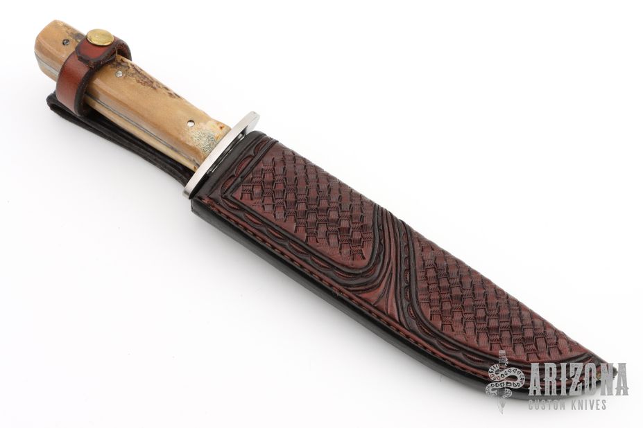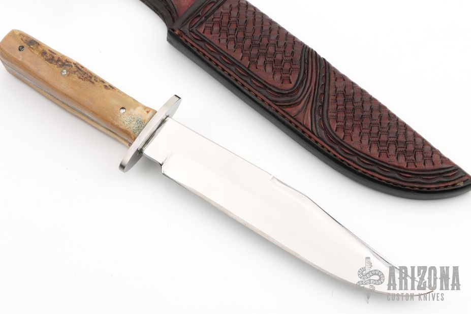This bowie features a mirror polished blade with false top edge, .174" blade stock and 1.323" blade depth, full tang construction. The handle has a stainless steel guard and stag scales. Comes with a hand tooled brown leather sheath by Treestump Leather. Has been resharpened, the handle is a little rough and this knife may have been rehandled to its current condition. Has some scratches, good condition otherwise.