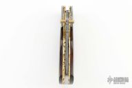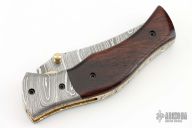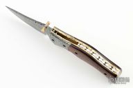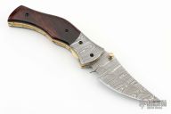 This linerlock by SMID Damascus features a Damascus blade with file worked blade spine and brass thumbstuds. The handle has Damascus bolsters, wood scales, file worked brass liners and a fileworked stainless steel backspacer. Nice blade seating and lockup. Comes with leather belt sheath. New from maker!
