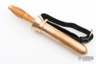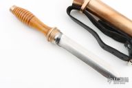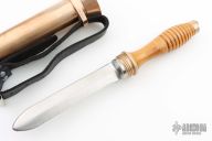 This is a handsome and traditional piece of equipment manufactured to rigid U.S. Navy specifications originally set down in the 1929 Hull Standard Plan Drawing and cherished by Navy and commercial divers throughout the world. It has a 7" stainless steel blade with a clear Maple handle. The knife screws into the top 1/2" of the cast brass sheath using Acme threads which not only hold it securely in the sheath but also permit it to be easily and quickly removed. The upper edge of the knife blade is cut with saw teeth while the lower edge is a conventional knife edge. The belt strap is top grain leather. It is as much sought after by collectors for its unique design and appearance as by divers for its utility underwater. Has a little patina, some scuffs and scratches, otherwise excellent condition.