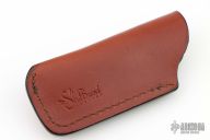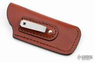 This Small brown leather sheath by SoulBound Leather is made from premium full grain English Bridle Leather from Wickett & Craig and has a stainless steel pocket clip. New from maker. 4" tall and 1.75" wide. It will fit a knife 3.75-4.5" in length closed, and 1-1.25" in width. Not to exceed 0.5" in thickness.