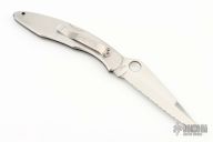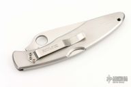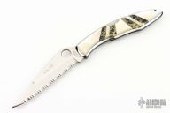 This Police knife by Spyderco features satin finished blade with a thumbhole and fully serrated edge. The handle is stainless steel with gold lip pearl and nickel silver inlays. Has a tip down stainless steel clip. Comes with a Spyderco C07P box. Has some light scratches, excellent condition otherwise.