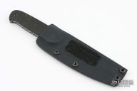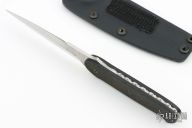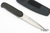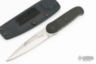 This knife by Bud Nealy features a hand rub satin finished blade with a sharpened top edge, full tang construction with .136" blade thickness and 1.086" blade depth. Textured black G-10 scales. Notching on thumbrest and finger rest areas and nice filework along the entire tang. Includes Kydex sheath. This model is very similar to Nealy's Y2K and Pheonix models. The serial # on the blade is 7874. Other than a few minor scratches on the blade (mostly from sheath), this knife is in excellent condition.