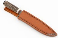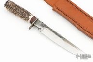 This knife by Forged in Patagonia features a hand forged blade with satin grinds and forge finished flats, false top edge, .176" blade stock and 1.095" blade depth, hidden tang construction. The handle has a steel guard and butt, stag grip with stacked leather spacers. Comes with a brown leather sheath. New from maker.