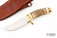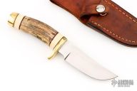 This knife by Mike Parsons features a satin finished blade with .178" blade stock and 1.208" blade depth, hidden tang construction. The handle has a brass guard and butt with a stag grip, mammoth ivory and black spacers. Comes with a brown leather sheath. Has a few scratches, otherwise good condition.