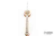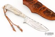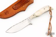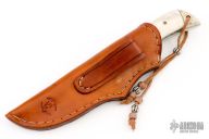 This knife by Paul Neil features a mirror polished blade with fileworked spine, .142" blade stock and 1.199" blade depth, full tang construction. The blade has a feather engraved into the b-side. The handle has an engraved stainless steel guard, stag scales with mosaic pins. Comes with a brown leather sheath with snake skin inlay. Has a couple light scratches, otherwise excellent condition.