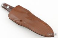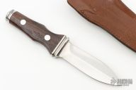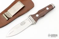 This is a very attractive boot knife from AG Russell. This is the older model made in Solingen, Germany. The mirror polished double edged blade is .103" thick and .909" deep at the ricasso and double-edged. Scales are rosewood. Integral construction with aluminum pins. Comes with a brown leather sheath. has a few light scratches, otherwise excellent condition.