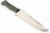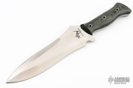 This Equatorian from Mercworx features a hand rub satin finished spear point recurved blade with sharpened top edge and notched thumbrest, .253" blade stock and 2.511" blade depth, full tang construction. The handle has black canvas micarta scales. Has some light scratches, otherwise excellent condition.