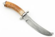This knife by Cleston Sinyard features a Damascus blade with notched thumbrest, .262" blade stock and 1.047" blade depth, hidden tang construction. The handle has a polished steel guard and butt, stag grip with black/white spacers. Has some light scratches otherwise excellent condition.