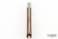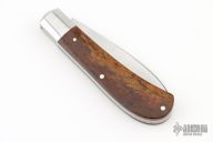 This slipjoint by Manual Saldana features a hand rub satin finished blade with nail nick. The handle has satin finish bolsters, rag micarta covers, stainless steel liners and spring. Has half stop, flush in all positions. Comes with a leather slip sheath.  Excellent Condition.