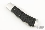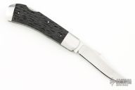 This lockback by Luke Swenson features a hand rub satin finished clip point blade with swedge and nail nick. The handle is comprised of stainless steel bolsters, jigged black paper micarta covers, mammoth ivory escutcheon, stainless steel liners with jeweled interiors, and a stainless steel lockbar with crosshatch pattern on the lock relief. Comes with zippered case. New from maker at the 2024 Blade Show.