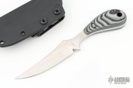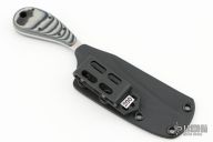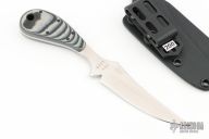 This Push Dagger by Mickey Yurco features a satin finished blade with .134" blade thickness and 1.098" blade depth, full tang construction. The handle has black/grey G-10 scales. Comes with a kydex sheath. New from maker at the 2024 Blade Show. #4513