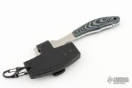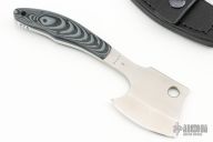 This Small Hatchet by Mickey Yurco features a satin finish blade with .177" blade stock, 2.090" blade depth, 2.5" blade length, full tang construction. The handle has grey/black G-10 scales. Comes with a leather sheath with S-biner. New from maker at the 2024 Blade Show. #4688