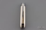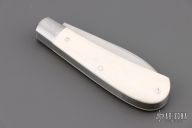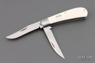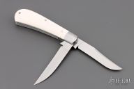 This Wharncliffe Trapper by Daniel Keown features hand rub satin finished blades with nail nicks. The handle has 416 stainless steel bolsters with integral liners, mammoth ivory covers, stainless steel springs, stainless steel pins and escutcheon. Has half-stop, flush in all positions. Comes with a zippered case. Excellent condition.